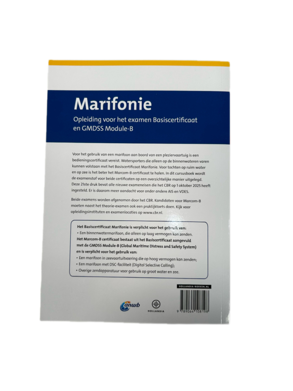Om gebruik te kunnen maken van een marifoon in de zogeheten zeevaartuitvoering (op ruim water of op zee) en/of voor het communiceren via het nieuwe wereldwijde systeem voor nood,- spoed- en veiligheidsverkeer is het aanvullende certificaat GMDSS Module-B verplicht. Basiscertifcaat plus de module GMDSS geeft u het bedieningscertificaat Marcom-B. Het tweede deel van het ANWB Cursusboek Marifonie bevat de leerstof voor het theoretisch examen voor de GMDSS Module-B.